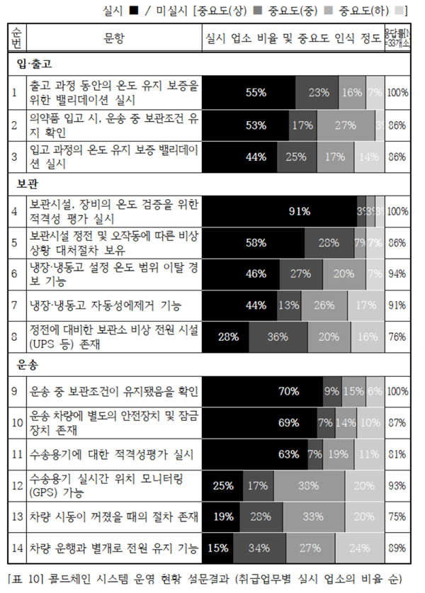세부 문항을 입고 및 출고, 보관, 운송 등 취급업무별로 구분하여 실시 업소의 비율 순으로 배열한 결과, 입·출고와 관련된 문항에서는 실시하는 업소와 실시하지 않는 업소의 비율에 큰 차이를 보이지 않았다. 특히 입·출고 과정에서의 온도 유지 보증을 위한 밸리데이션은 보관이나 운송 과정에 대한 적격성평가에 비해 상대적으로 소홀해 보인다. (괄호 안은 실시 비율)