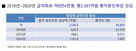 최근 3년간 항암제 급여기준 확대로 약 8만4000명의 환자가 총 2597억원의 본인부담액 경감효과를 얻은 것으로 나타났다.