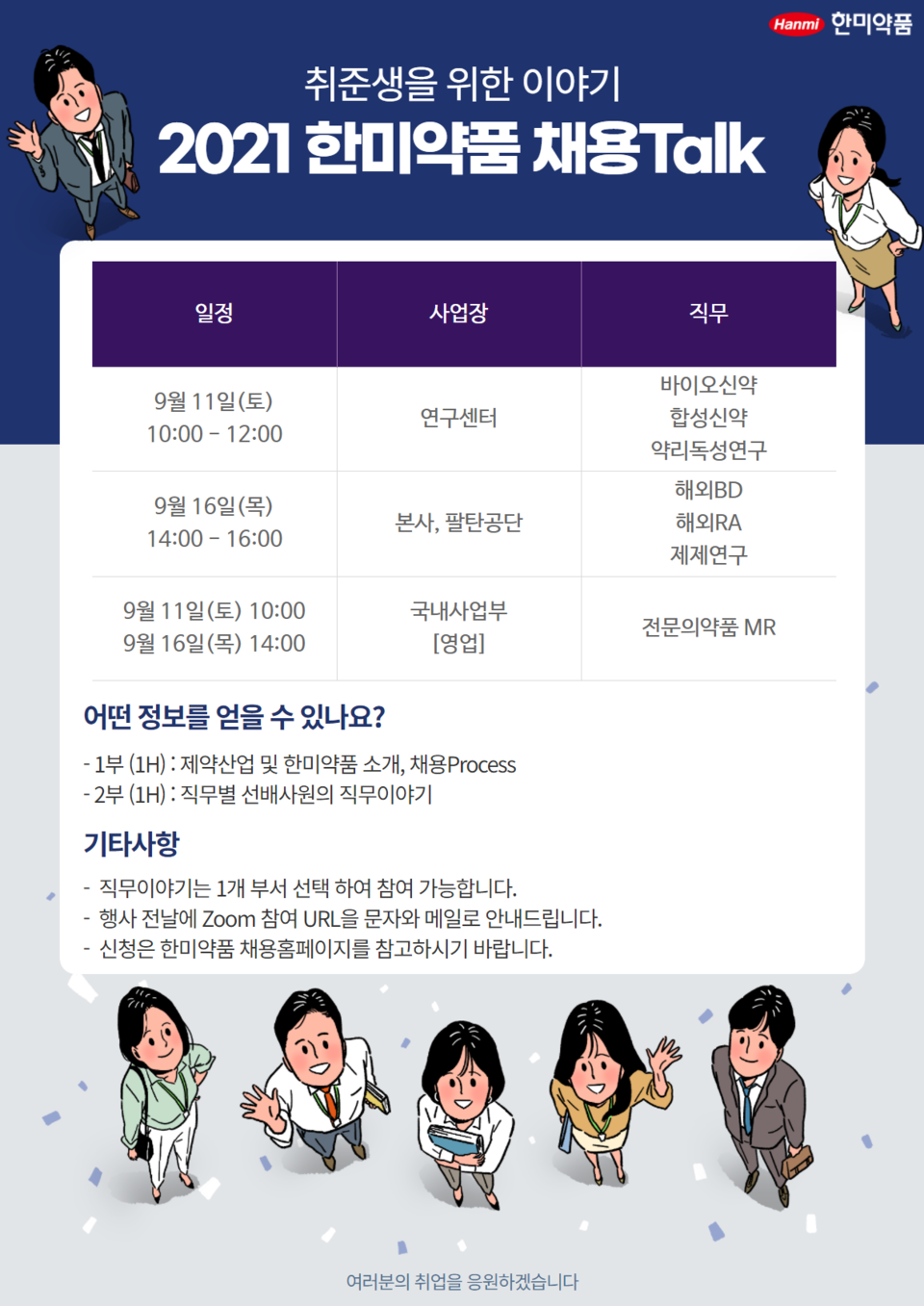 해당 시간에는 ▲제약산업 및 한미약품 소개 ▲채용 Process ▲직무별 선배사원의 직무이야기 등을 들을 수 있다. 자세한 내용과 신청 방법 역시 한미약품 채용 홈페이지에서 확인할 수 있다.