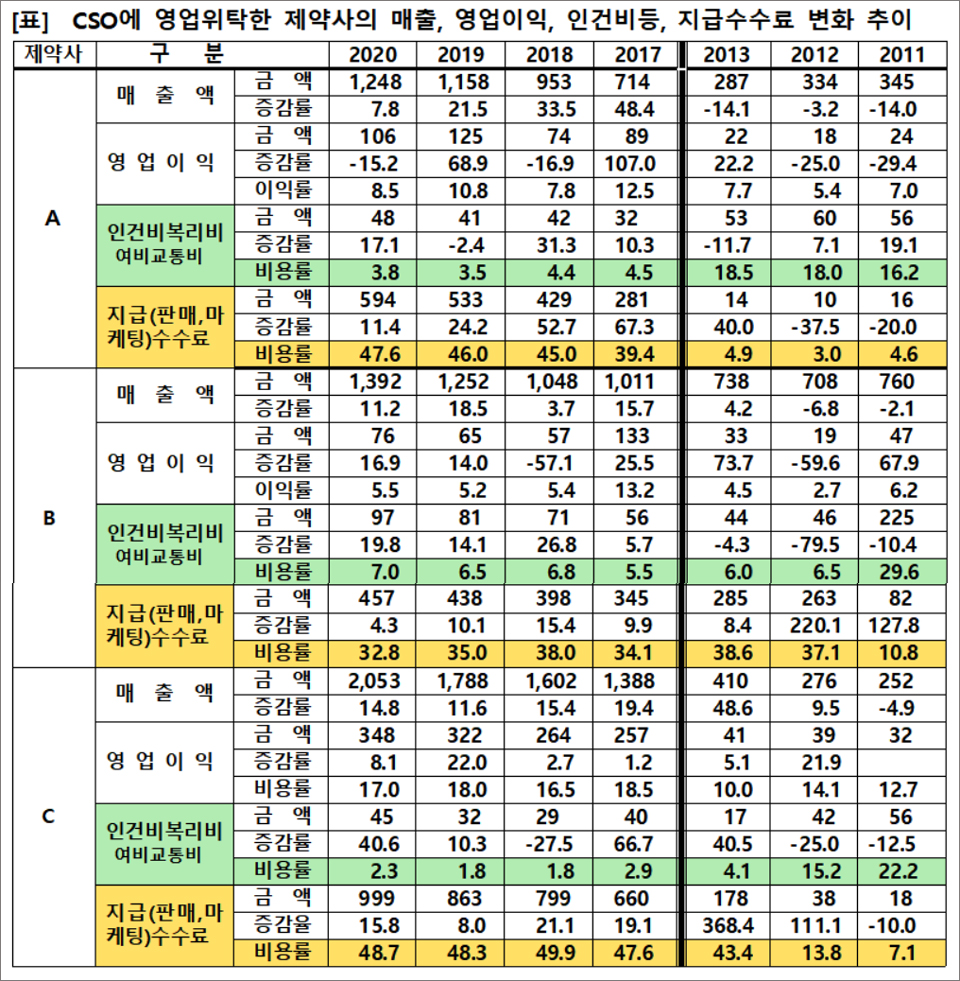 A사의 경우, 2011년~2013년의 매출액 대비 인건비등 비율은 16.2%~18.5%로 높았지만 2017년~2020년은 3.5~4.5%로 급락했다. 대신 지급수수료의 매출액 비중은 인건비등과 정반대로 2011년~2013년 3.0~4.9%에서 2017년~2020년 39.4~47.6%로 급등했다. [표]에는 없지만 A사의 2014년 손익계산서의 인건비등과 지급수수료를 볼 때, 이미 그때부터 CSO 제제로 전환을 준비했던 것으로 보인다.