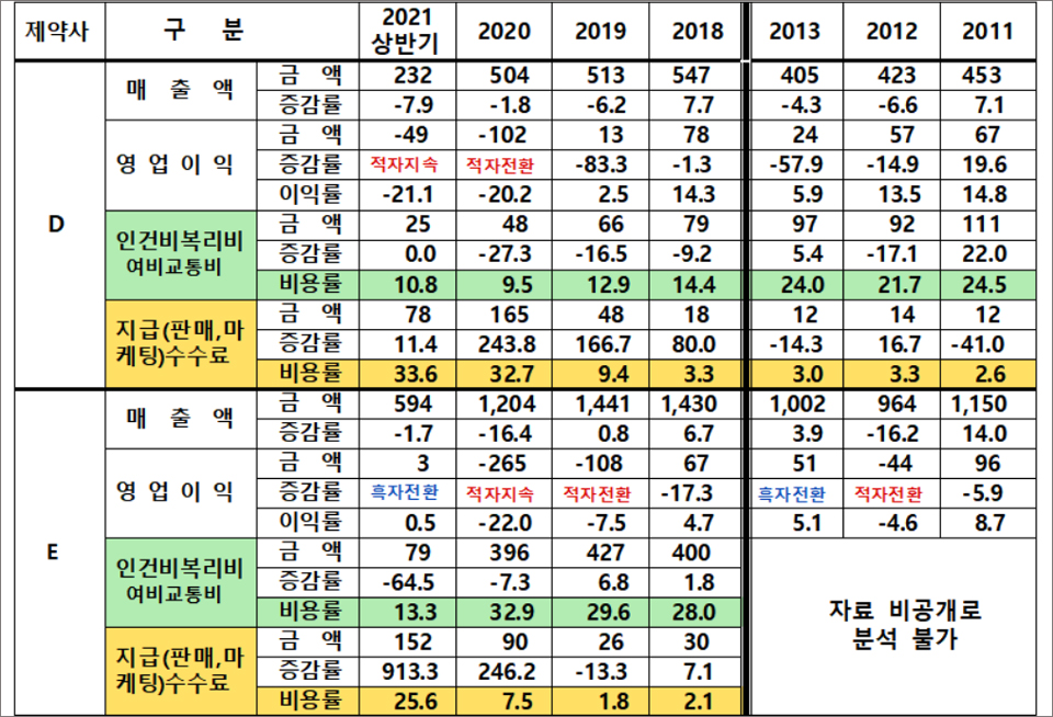 D사와 E사 영업조직의 CSO전환은 최근으로 판단된다. D사의 경우 지급수수료의 매출액 비중이 2018년 3.3%에서 2019년 9.4%, 2020년 32.7%로 급등한 것을 보면 CSO 체제 전환은 2019년부터 시작해 2020년에 본격적으로 이루어진 것으로 보인다.