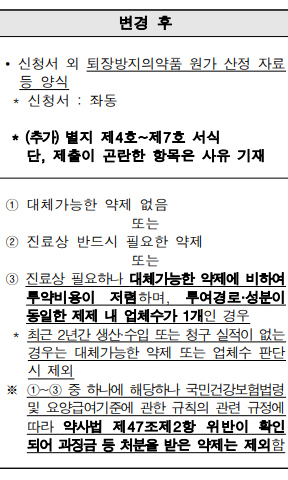 기존에는 ①대체가능한 약제가 없거나 ②진료상 반드시 필요한 약제 두가지 조건이었는데, ③진료상 필요하나 대체가능한 약제에 비해 투약비용이 저렴하며, 투여경로·성분이 동일한 제제 내 업체수가 1개인 경우라는 세번째 기준이 신설됐습니다.