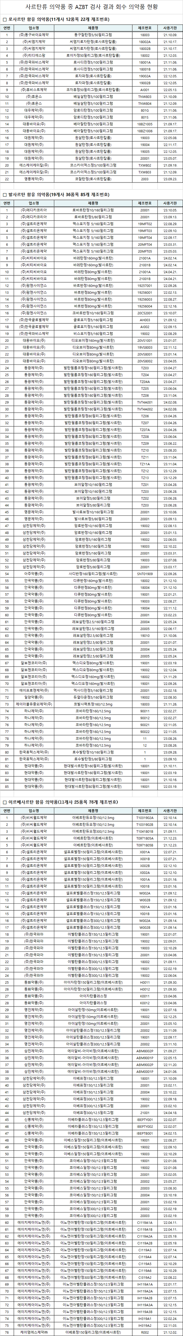 또 1일 섭취 허용량을 초과한 36개사 73품목의 183개 제조번호 사르탄류 의약품을 해당 제약사에서 자발적으로 회수 중이며, 9월부터는 AZBT가 1일 섭취 허용량 이하인 사르탄류 의약품만 출하되고 있다고 설명했다.