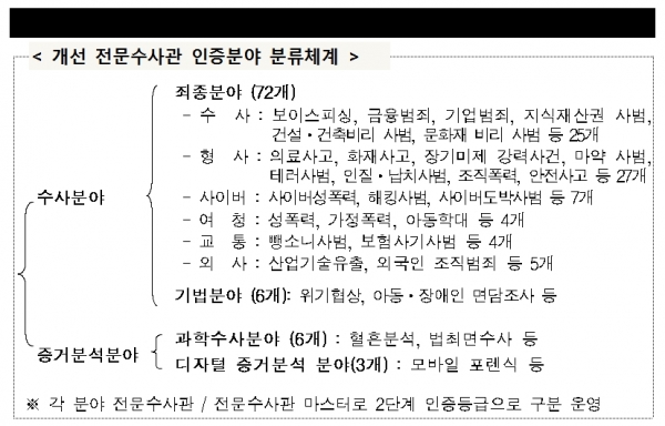 구체적으로 종전에는 '수사기법 분야'(위기협상, 아동 면담조사 등 6개), '증거분석분야' 과학수사(혈흔분석 등 6개)-디지털 증거분석(모바일 포렉신 등 3개) 등에서 전문수사관을 인증해 왔다. 그동안 인증된 전문수사관은 2586건, 2343명이다.