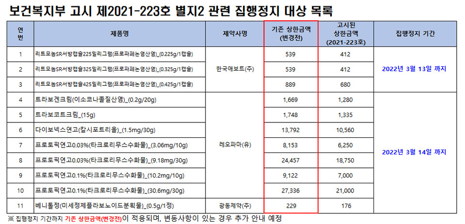 레오파마의 트라보겐크림 등 7품목, 광동제약의 베니톨정의 상한금액은 내년 3월 14일까지 유지된다.