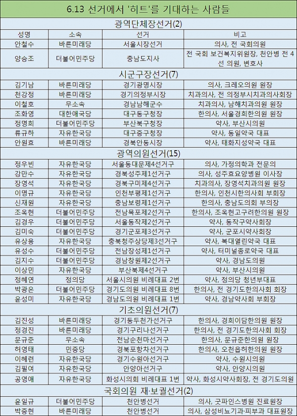 24일 현황자료를 보면, 보건의료인은 이번 지방선거에 광역단체장선거 1명, 시군구장선거 7명, 광역의원선거 15명, 기초의원선거 7명 등 30명이 출마채비를 마쳤다. 직능별로는 의사 4명, 치과의사 3명, 한의사 9명, 약사 14명이다. 후보등록 마지막 날인 오늘 추가 등록자가 있을 수 있기 때문에 최종 본선 진출자는 더 늘어날 것으로 보인다. 같은 날 실시되는 국회의원 재보궐선거에는 의사출신 2명이 격돌한다.