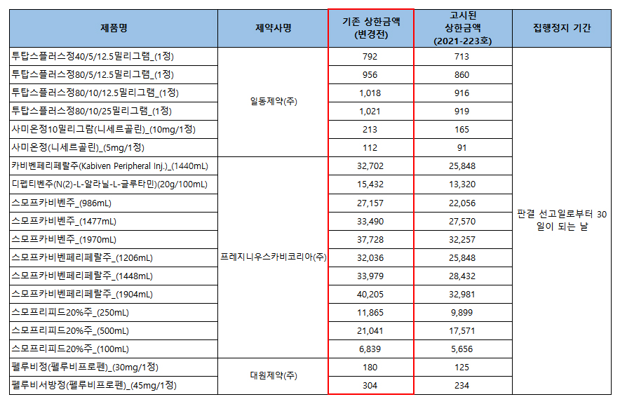 이번 일동제약과 프레제니우스카비 품목들은 판결 선고일로부터 30일까지 기존 상한금액을 유지한다.