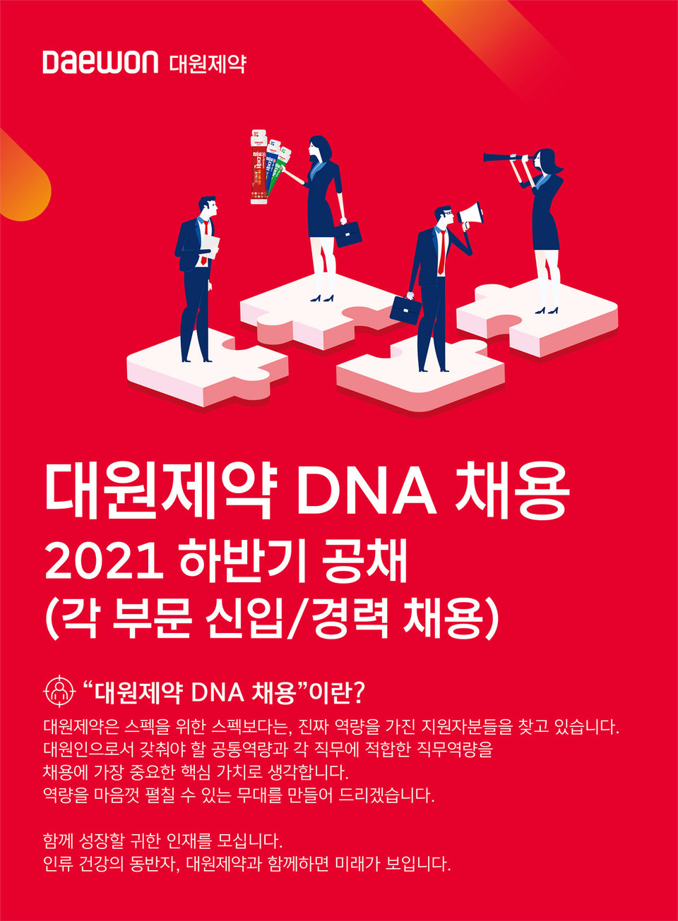 한편 대원제약은 올해부터 ‘대원제약 DNA 채용‘이라는 이름으로 공채를 진행하고 있다. 소위 ‘스펙을 위한 스펙‘이 아닌 역량 중심의 채용으로, 대원인의 DNA를 보유한 인재를 찾는다는 의미다.