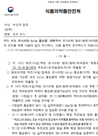 내용을 보면 우선 내달 8일까지 제조 및 수입하는 로사르탄 원료(완제) 의약품 계통조사 자료를 제출해야 한다. 시중 유통 가능한 유효기간 내 모든 제조번호에 대해 불순물 시험검사 결과도 11월 30일까지 내야 한다.