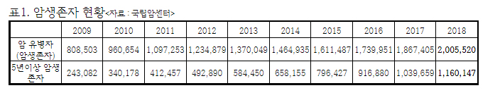 암 예방과 조기검진 확대, 암 치료기술의 발전으로 2018년 기준 암 상대상존율이 70%를 넘어서고, 5년 넘게 재발하지 않아 완치 판정을 받은 사람이 116만명에 달하면서 부정적 인식은 개선되고 있는 것으로 분석된다.