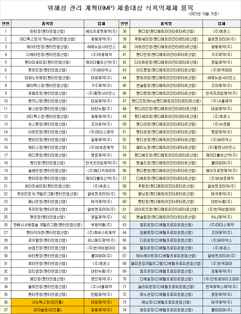 펜터민, 펜디메트라진 등 향정신성의약품 식욕억제제 74품목은 내년 1월 14일까지 위해성관리계획(RMP)을 제출해야 한다.