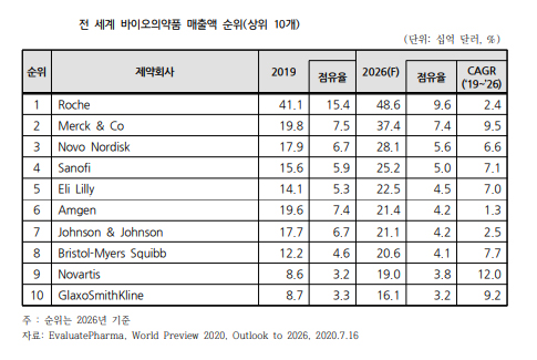 2019년 기준 글로벌 바이오의약품 매출 순위를 보면 로슈가 411억달러로 15.4%를 차지하며 1위를 기록했다. 2026년에도 로슈가 1위 자리를 유지하지만 점유율은 9.6%로 줄어들 것으로 전망했다.