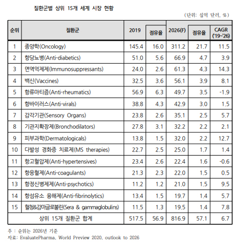 구체적으로 보면 2026년 종약학 분야는 면역항암제(Immuno-oncology)와 표적항암제(Protein kinase inhibitors) 중심으로 높은 점유율과 성장률을 유지할 것이란 예상이다.