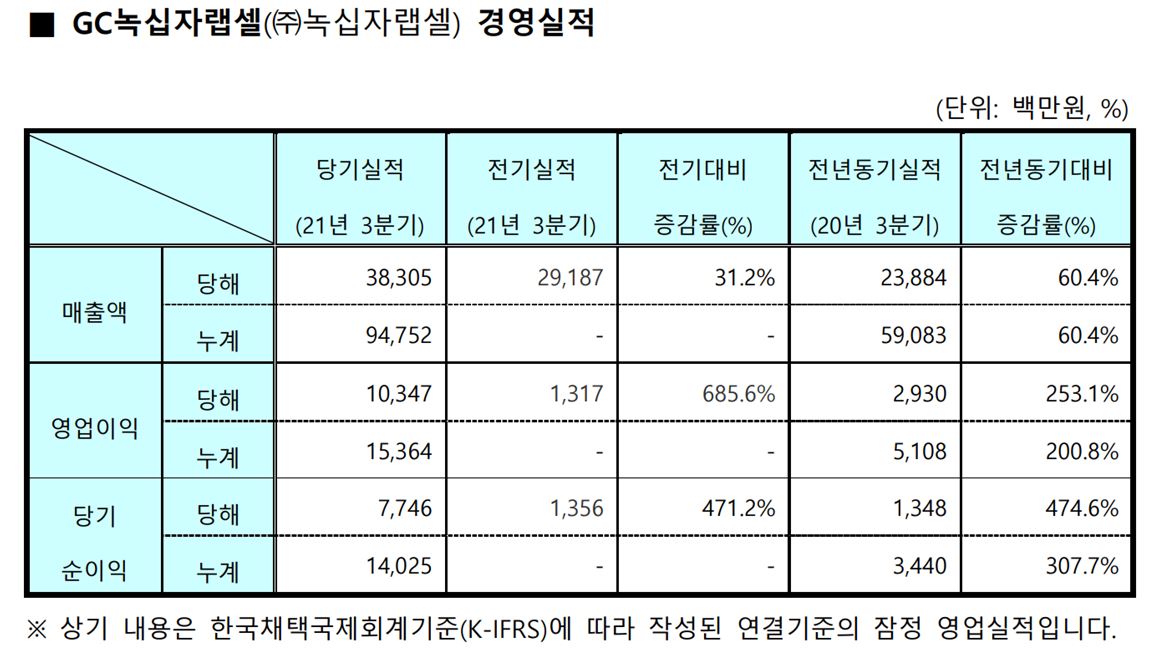 GC녹십자랩셀(대표 박대우)은 올해 3분기 잠정 경영실적(연결재무제표 기준)을 집계한 결과 매출 383억원, 영업이익 103억원을 기록했다고 25일 공시했다.
