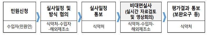 비대면실사 절차는 민원신청 → 실사일정 및 방식협의 → 실사일정통보 → 비대면실사(실시간 자료검토 및 영상회의) → 평가결과 통보로 진행된다.