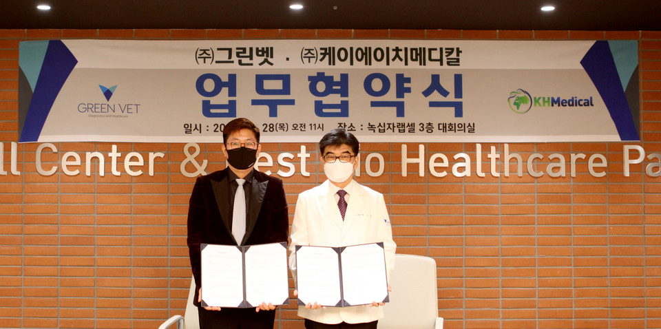 반려동물 토탈 헬스케어 기업 그린벳(대표 박대우)은 KH메디칼과 업무 협약을 체결했다고 3일 밝혔다. 협약을 통해 양사는 반려동물 대상 진단검사 연구·개발, 기타 상호 간 필요하다고 인정되는 사항 등에 대해 협력한다.