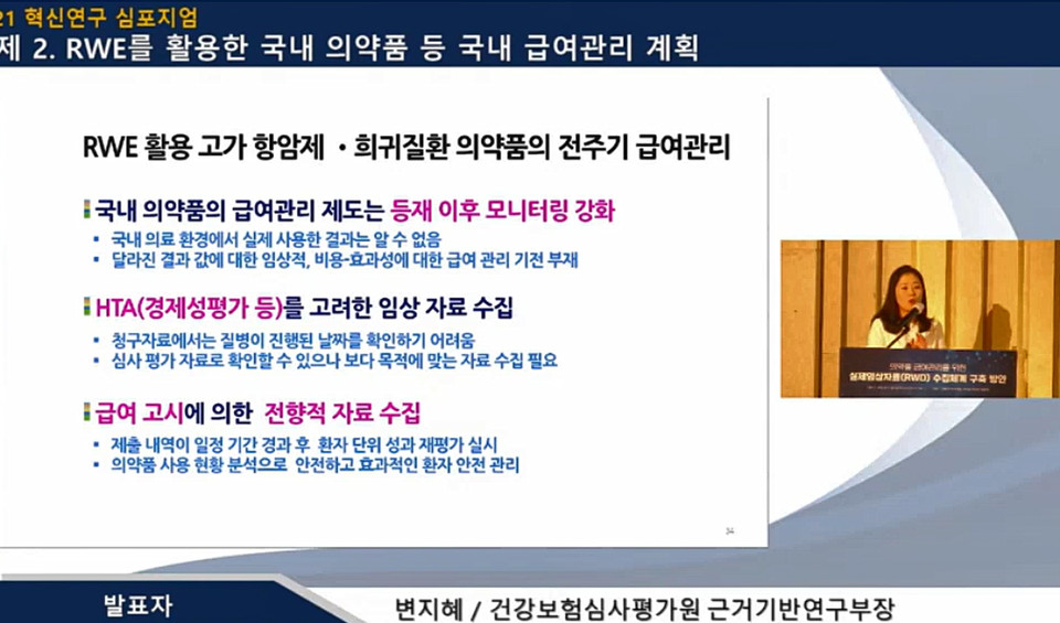 건강보험심사평가원 심사평가연구소 혁신연구센터 변지혜 부장은 4일 열린 'RWE를 활용한 의약품 등 급여관리 계획'에서 RWE를 활용한 등재의약품의 전주기 급여관리 방안을 발표했다.