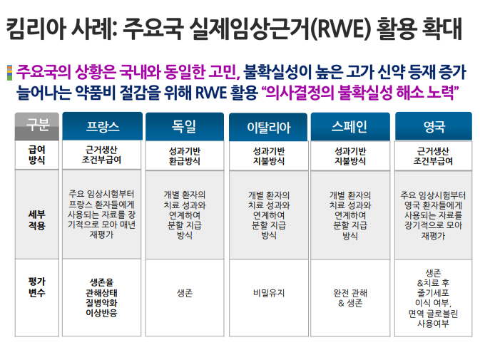 백혈병 치료제 고가약제 킴리아는 프랑스와 독일, 이탈리아, 스페인, 영국 등에서 RWE를 활용해 의사결정의 불확실성을 해소하려고 노력 중이다.