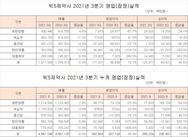 히트뉴스가 빅5제약사의 3분기 영업실적(잠정) 분석한 결과, 전년동기 대비 매출은 6% 증가하고, 영업이익과 순이익은 각각 79.7%와 40.8% 늘었다.