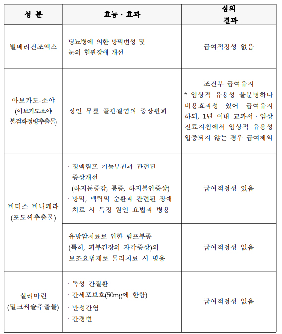 이에 따라 빌베리건조엑스(당뇨병에 의한 망막변성 및 눈의 혈관장애 개선)와 실리마린(독성 간질환, 간세포보호, 만성간염, 간경변)은 급여목록에서 제외될 것으로 보인다.