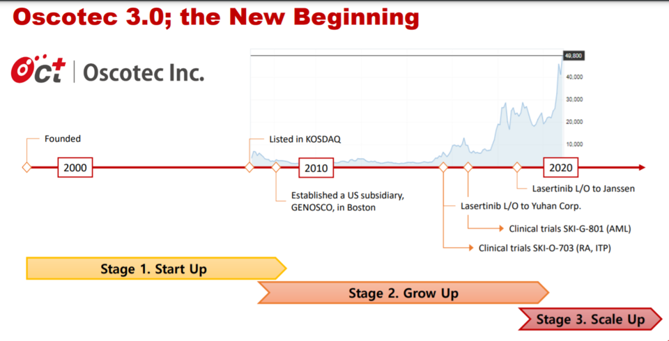 오스코텍은 창업 후 첫 10년은 척박한 국내 바이오 환경에서 연구기반을 닦았고, 그 다음 10년은 코스닥 상장을 통해 제노스코를 설립해 글로벌 프로젝트를 수행했습니다. 이 당시 결실로 레이저티닙을 발굴해 내 라이선스 아웃을 하고 지금의 임상 파이프라인을 구축할 수 있었죠. 이런 결과로 이제 재투자할 수 있는 여건이 마련됐습니다.