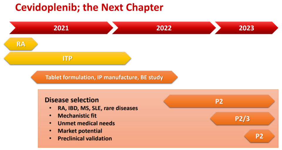 따라서 임상 결과에 대해 매우 희망적인 기대를 걸고 있습니다. 그 외에 알려진 자가면역질환만 100여가지 이상입니다. ITP 와 마찬가지로 SYK 저해제가 기전적인 적합성을 가지면서 동시에 미충족 수요가 크고 어느 정도 시장성을 가진 신규질환을 검토 중이며 내년 중에 새로운 임상에 돌입할 예정입니다.