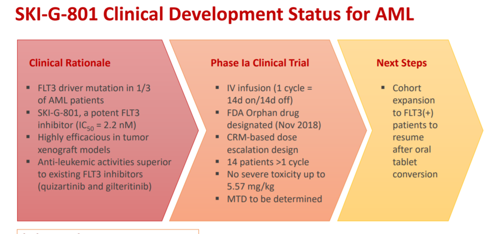 SKI-G-801은 처음 FLT3 저해제로 FLT3 돌연변이를 갖는 급성골수백혈병 (AML) 환자를 대상으로 개발되었습니다. 미국에서 임상 1상이 진행됐고 이제 거의 완료되어 가고 있습니다. 1상은 안전성과 용량 결정에 초점을 맞춘 임상이고 이를 통해 충분한, 어쩌면 예상을 뛰어넘는 안전성을 확보했습니다.