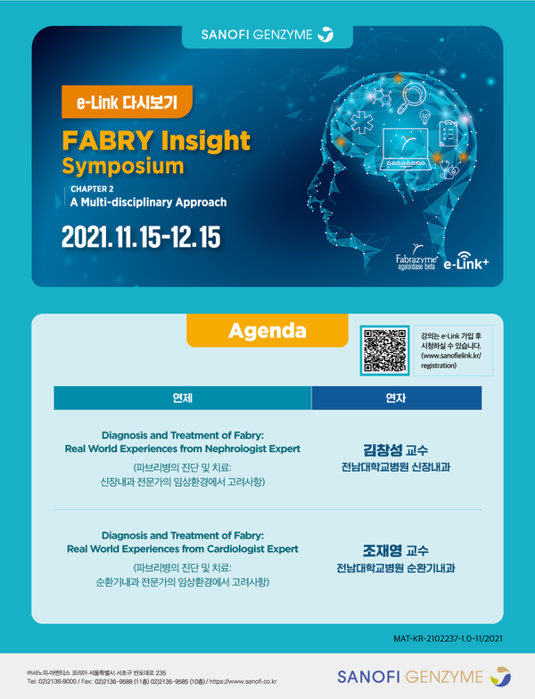 글로벌 헬스케어 기업 사노피(Sanofi)의 국내 제약사업부문인 사노피-아벤티스 코리아(대표 배경은)가 지난 10일 신장내과·순환기내과 전문의와 함께한 'Fabry Insight '웹심포지엄의 다시보기 서비스를 제공한다.