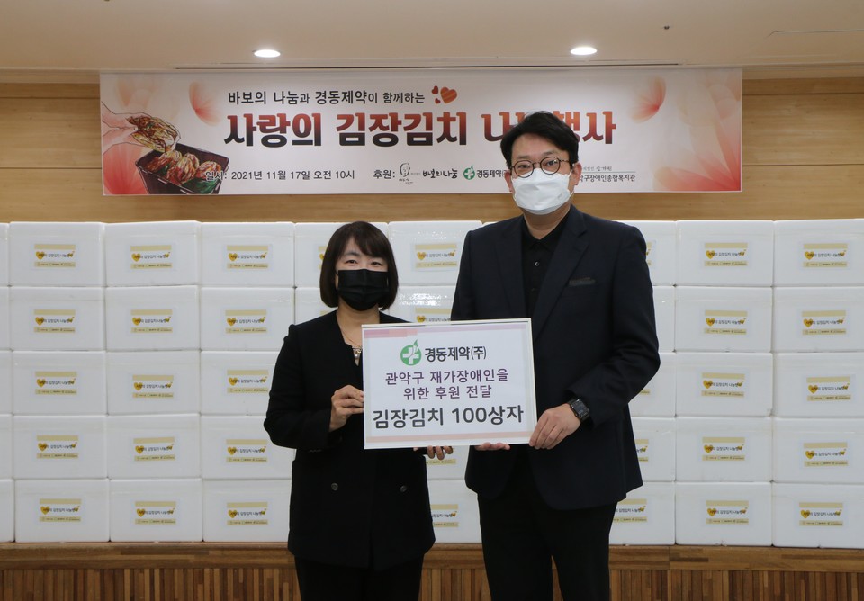 경동제약(대표 류기성)이 연말을 앞두고 이웃을 위한 '사랑의 김장김치 나눔행사' 후원금 전달식을 관악구장애인종합복지관에서 17일 가졌다.