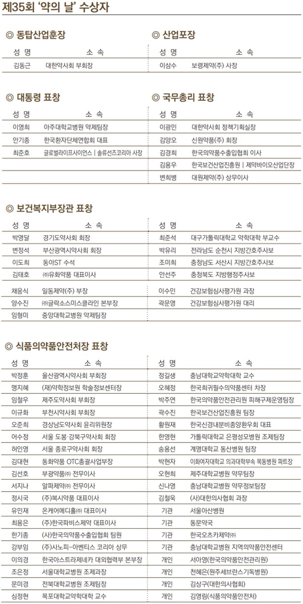 시상식에서는 대한약사회 김동근 부회장이 동탑산업훈장을 수훈하고, 보령제약 이삼수 사장이 산업포장을 받았다. 아주대학교병원 이영희 약제팀장, 한국환자단체연합회 안기종 대표, 솔루션즈코리아 최준호 사장이 대표령 표창을 받았다.