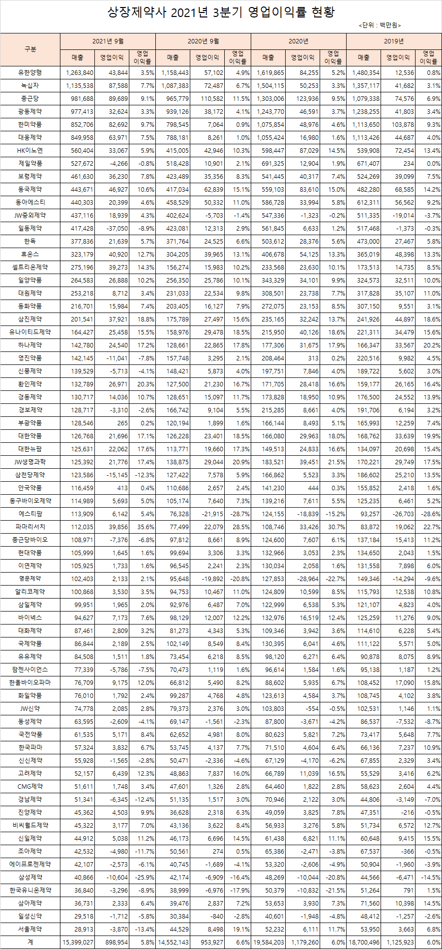 히트뉴스(www.hitnews.co.kr)가 코스피 및 코스닥 상장 제약 67개사의 2021년 3분기 누적 영업실적을 분석한 결과, 평균 영업이익률은 5.8%로 집계됐다.