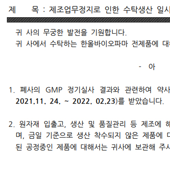 한올바이오파마는 23일 위탁 제약사들에 '제조업무정지로 인한 수탁생산 일시중지 요청건' 제하의 공문을 발송했다.