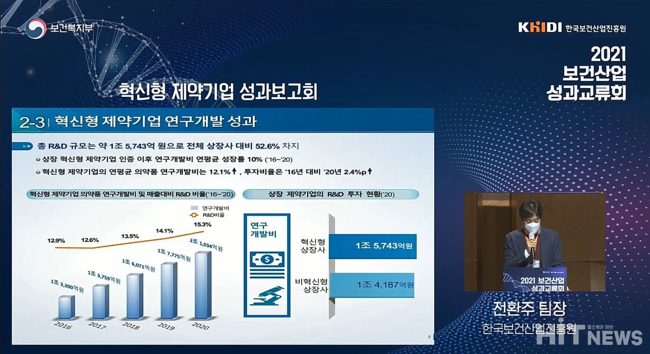 전환주 한국보건산업진흥원 팀장은 24일 드래곤시티 호텔에서 열린 '2021 혁신형 제약기업 성과보고회'에서 혁신형 제약기업 인증제도의 최근 5년(2016~2020년)간 성과를 소개했다.
