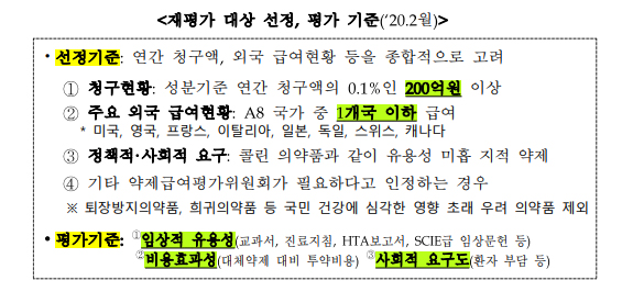 심평원 약제급여평가위원회 산하 사후평가소위에서 마련한 재평가 선정기준에 따르면, 연간 청구액과 외국 급여현황 등이 종합적으로 고려된다.