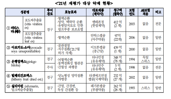 당초 재평가 대상이었던 160품목(84개 제약사)의 총 청구액은 1795억 원이다. 하지만 재평과 과정에서 은행엽엑스(348억 원)와 포도엽추출물(97억 원) 성분이 선정기준을 미충족함에 따라 평가대상에서 제외됐다.