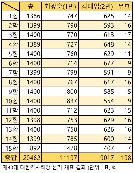 최광훈 후보는 대한약사회관 4층 강당에서 9,10일간 진행된 '제40대 대한약사회장 선거 개표'에서 총 2만462표 중 1만1197표를 획득하며(득표율 55.26%) 제40대 약사회장선거 당선인 신분이 됐다. 선거 중 최 후보는 투표함별 개표 결과에서 연이은 우위를 점했다.