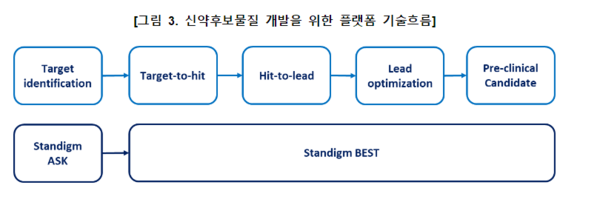 현재 회사는 당사는 신규 타깃을 발굴할 수 있는 ASK 플랫폼, 신규 물질을 설계하고 최적화할 수 있는 BEST 플랫폼을 보유하고 있는 기업이다. ASK와 BEST 플랫폼을 결합해 신규타깃 발굴부터 선도물질 확보까지 7개월 내 완료할 수 있는 workflow AI를 완성했다.