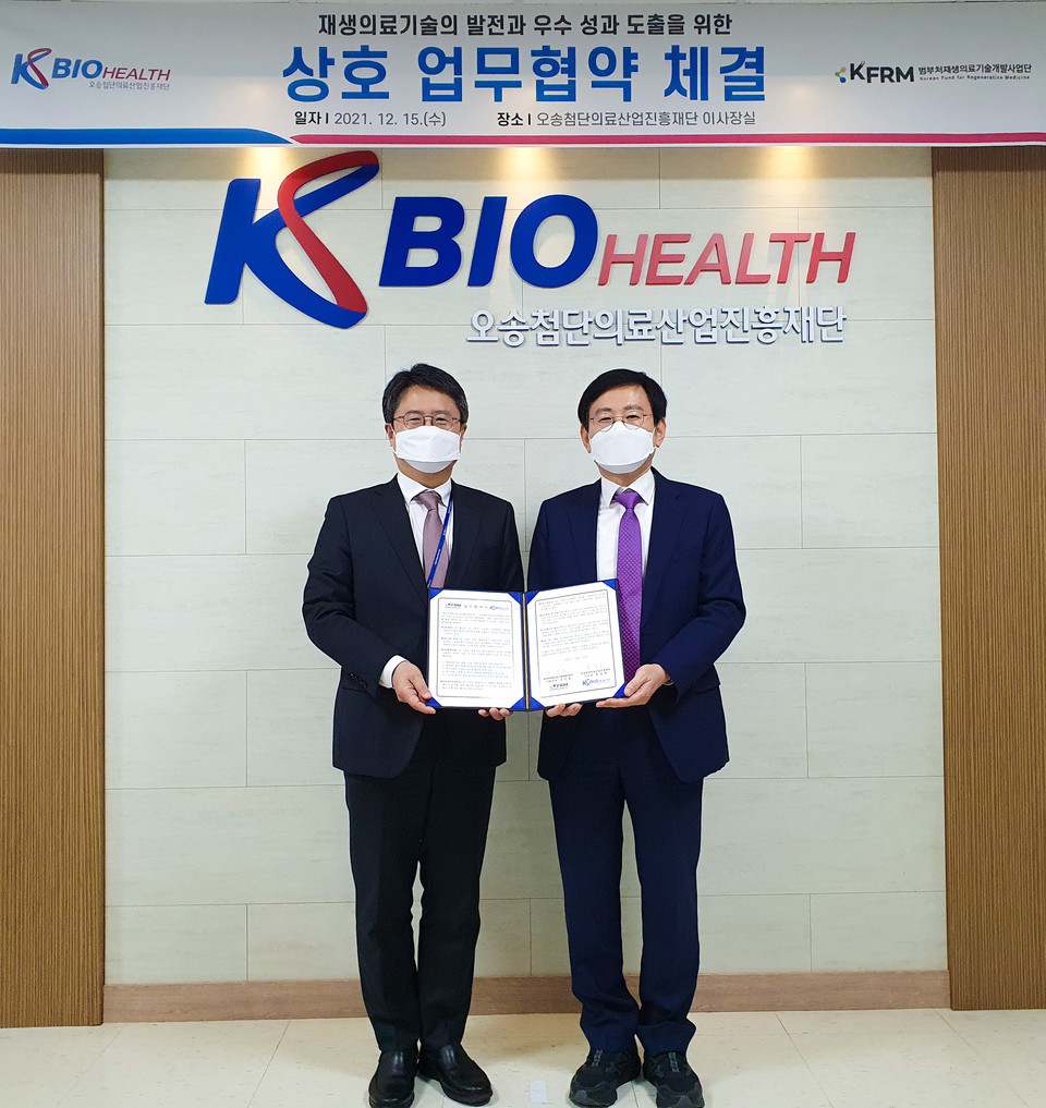 오송첨단의료산업진흥재단(이사장 차상훈, 이하 KBIOHealth)과 범부처재생의료기술개발사업단(사업단장 조인호, 이하 KFRM)이 15일 업무협약(MOU)을 체결했다고 밝혔다.
