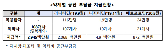 라니티딘 청구액은 107개 제약사 대상 21억원으로 복용환자 수는 116만 4853명이며 재처방·재조제 환자수는 8만 1351명이다.