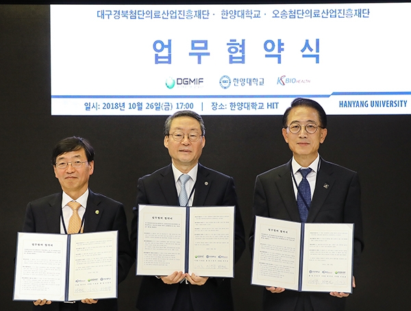 대구경북첨단의료산업진흥재단(이사장 이영호, 이하 대구첨복재단)과 오송첨단의료산업진흥재단(이사장 박구선, 이하 오송첨복재단), 한양대학교(총장 이영무) 세 기관은 지난 26일, 한양대학교에서 상호교류 및 협력체계 구축을 위해 업무협약을 체결했다고 29일 밝혔다.