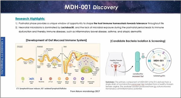 MDH-001은 마이크로바이옴을 활용해 개발 중인 파이프라인이다. 미생물 중 약 90% 이상이 락토바실러스(Lactobacilli) 균이다. 엠디헬스케어는 국내 여성들의 질, 구강 등에 분포하는 락토바실러스 균을 스크리닝 해 MDH-001 파이프라인을 개발했다.
