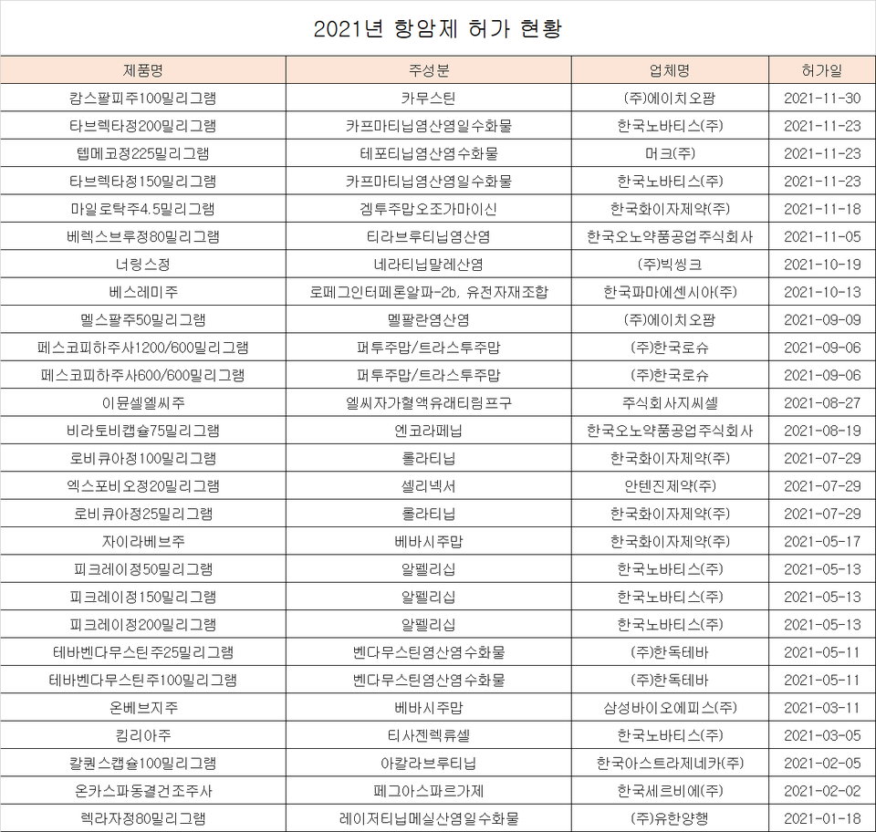 허가된 항암제로는 유한양행의 비소폐암치료제 '렉라자정'이 국산신약 31호로 허가를 받았고, 노바티스의 CAR-T) 치료제 '킴리아주'는 첨단바이오의약품 1호로 허가받았다.