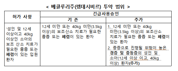 이에 앞서 식약처는 이달 7일 베클루리주의 투약 범위를 ‘성인과 12세 이상이고 40kg 이상인 소아의 보조산소 치료가 필요한 중증 또는 폐렴이 있는 입원 환자’로 변경 허가했다.