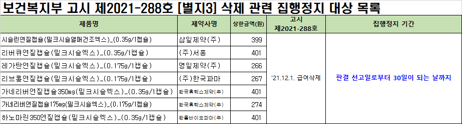 집행정지 대상 품목은 삼일제약 시슬린연질캡슐, 서흥 리버큐연질캡슐, 영일제약 레가탄연질캡슐, 한국파마 리브롤연질캡슐, 한국휴텍스제약 가네리버연질캡슐350mg과 175mg, 한올바이오파마 하노마린캡슐 등이다.
