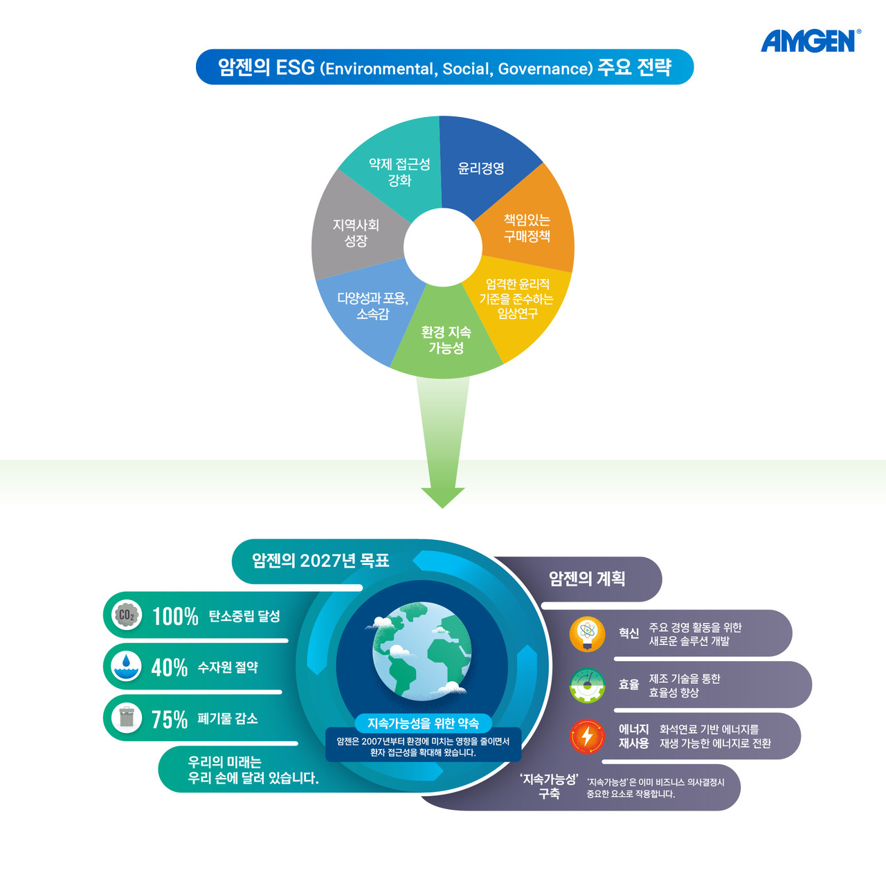 2021년부터 '글로벌 2027 환경 지속가능성 계획' 아래 '탄소 중립 100% 달성, 수자원 40% 절약, 폐기물 75% 감축'을 목표로 하고 있다. 이에 글로벌 암젠이 차지하는 탄소 배출량 중 약 15%가 업무용 차량이라는 점에 집중해 2027년까지 전 세계 업무용 차량 중 30%를 전기차로 전환할 계획이다.