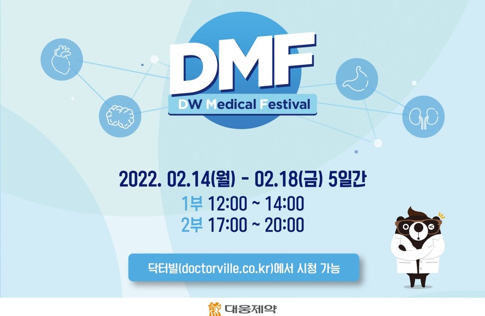 대웅제약(대표 전승호, 이창재)은 오는 14일부터 18일까지 5일 간 의료진을 대상으로 다양한 학술 정보와 최신 지견을 공유하는 온라인 학술행사 '대웅 메디컬 페스티벌(Daewoong Medical Festival, DMF)'을 개최한다고 8일 밝혔다.