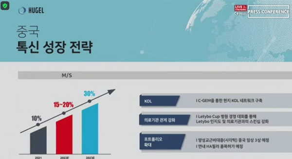 중국 보툴리눔 톡신 시장 진출도 눈에 띈다. 휴젤은 지난해 2월 국내 기업 최초이자 전 세계에서 4번째로 중국 보툴리눔 톡신 시장에 진출했다. 회사 측은 "약 3000여명의 의료 관계자가 접속하는 등 폭발적인 관심 속 진행된 '레티보(수출명) 온라인 론칭회'를 시작으로 유통 파트너인 사환제약과 중국 현지 법인 '휴젤 상하이 에스테틱'의 주도 아래 본격적인 중국 시장 공략에 나섰다"고 설명했다.