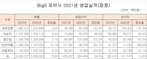히트뉴스가 매출 Big5 제약사(유한양행, 녹십자, 종근당, 한미약품, 대웅제약)의 2021년 영업실적을 잠정 집계한 결과, 전년대비 매출은 평균 5.6% 증가하고, 영업이익은 34.2% 늘어났지만, 순이익은 4.6% 줄어들었다.