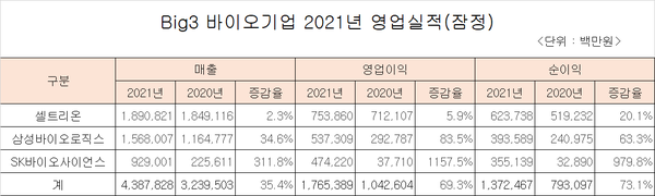 한편, 빅3 바이오기업의 2020년 실적을 살펴보면, 2020년에 매출 1조8491억을 기록해 지난해 매출 2조 달성 기대감이 있었던 셀트리온은 전년대비 2.3% 늘어난 1조8908억을 기록했다.