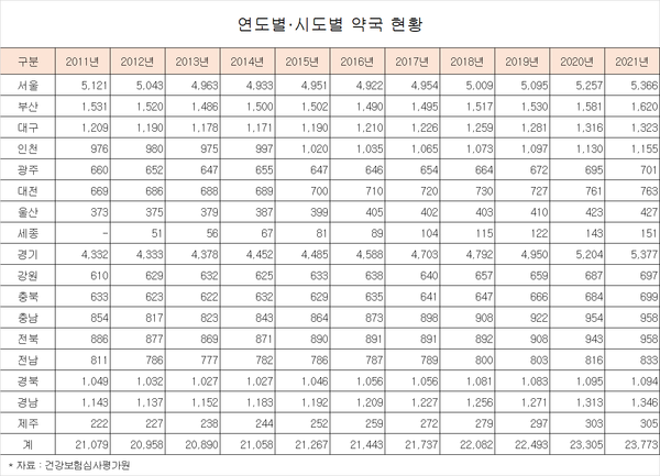 코로나19 2년간 전국적으로 약국 1300여곳이 증가한 것으로 나타났다. 히트뉴스(www.hitnews.com)가 건강보험심사평가원의 요양기관 현황을 집계한 결과, 2021년말 전국 약국은 2만3773개였다. 이는 2020년 연말 대비 468곳 증가한 것이고, 2019년말 대비 1280개소가 늘어난 것이다.